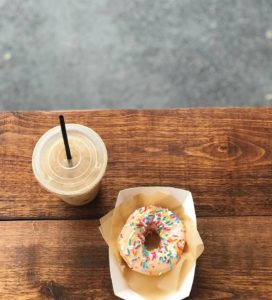 Sprinkle doughnut and iced coffee. Photo courtesy of Dough-Joes