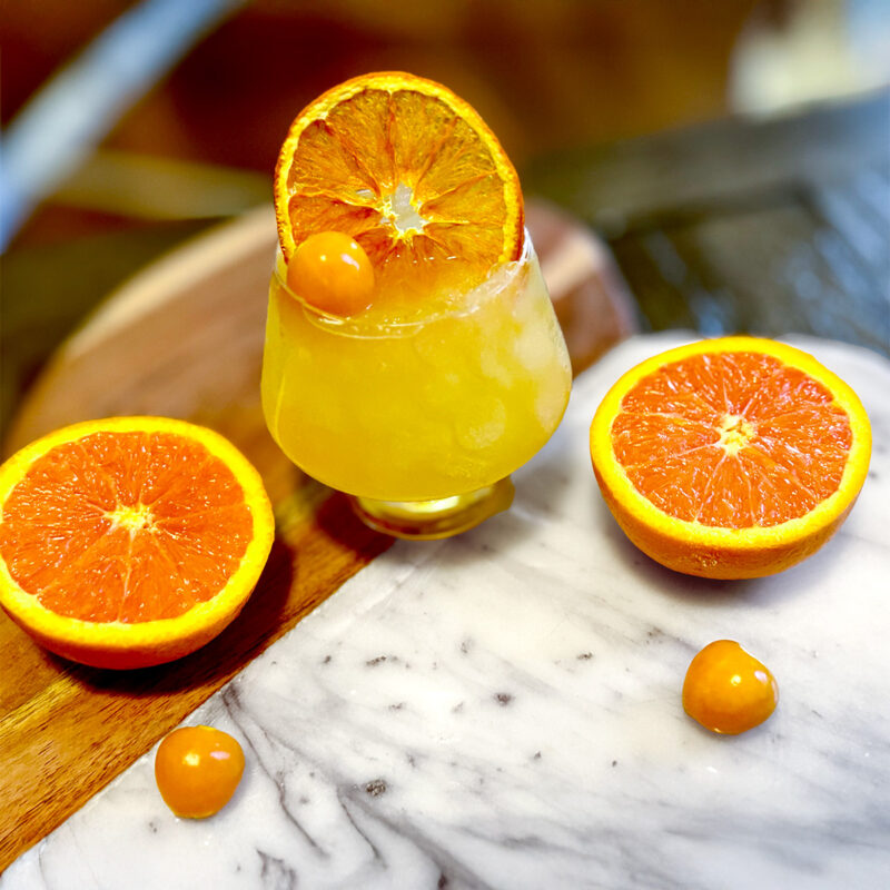 Combine all ingredients in a cocktail shaker with ice. Shake and double-strain over ice in an old-fashioned or other short glass. Optional: top with club soda. Garnish with an orange slice and/or gooseberries.