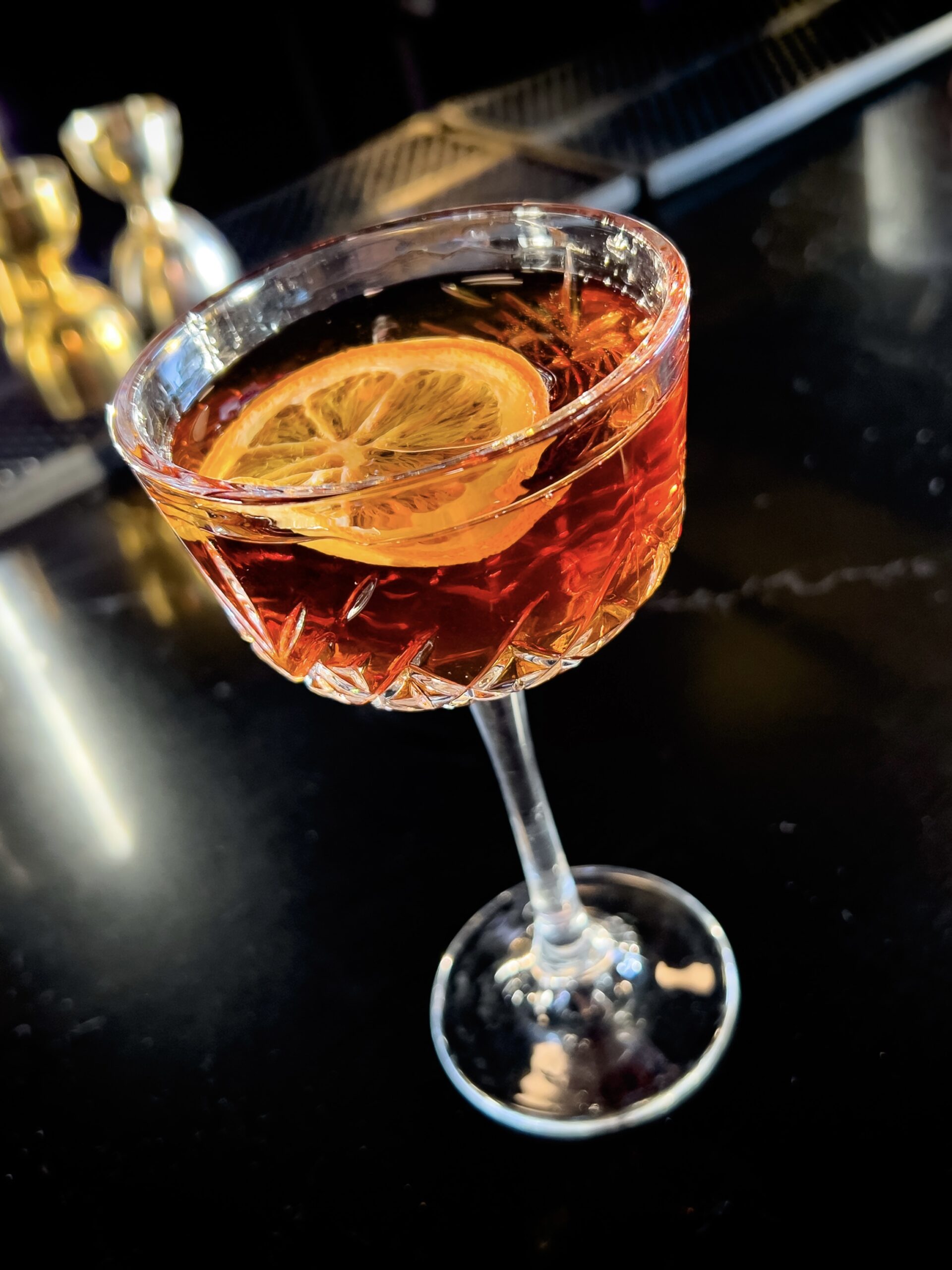 Combine ingredients in a cocktail mixing glass with ice. Stir and strain into and serve in a Nick and Nora glass (can also use a martini glass or coupe). Garnish with expressed orange peel.