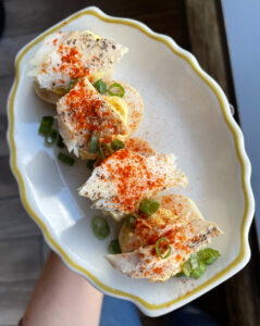 Rose Mushe: You always need salt, acid, heat, and mayonnaise. At Haberdish, we add hot sauce and vinegar to the yolk mixture. Of course, we add mayo, but we have a few other flavors in there: our house dill pickle brine, horseradish, and North Carolina’s own Texas Pete. In addition, our deviled egg is a smoked version. Once eggs are boiled, yolks are reserved and weighed out to get exact measurements of the other ingredients. The egg whites get smoked here in-house with cherrywood. For a bit of extra smoke flavor and a more filling deviled egg, customers have the option to add smoked N.C. trout on top.