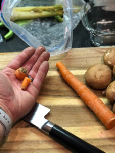 There really is no “recipe,” but I try to use roughly 2 parts onion to 1 part carrot and celery, combined. Then I add in peppercorns, thyme, parsley, a few bay leaves, and whatever vegetable scraps I have frozen. Avoid adding any cruciferous vegetables like broccoli and cauliflower or tomatoes, because they turn the stock cloudy and smelly. Once you’ve gathered the ingredients, brown those in a 6-quart stock pot, simmer in water for 1 to 2 hours or until the vegetables have sunken and the broth has darkened. Finally, strain and use as needed –– freezing the rest, of course!