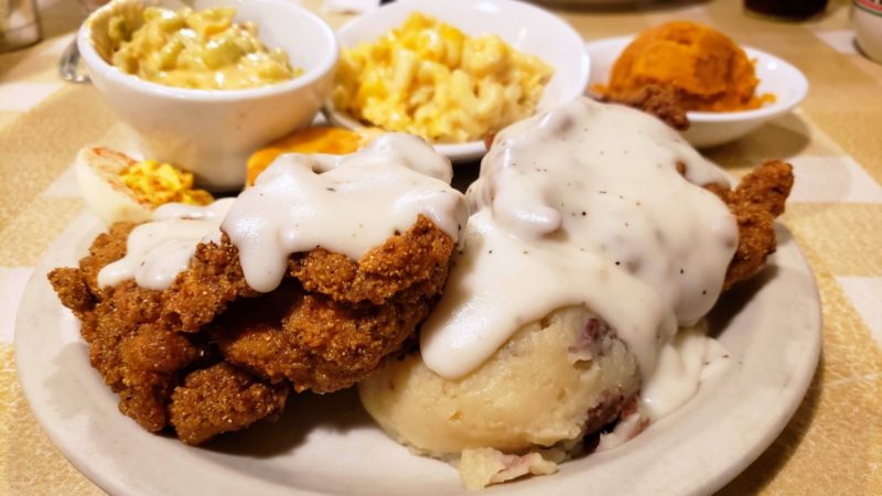 And That: Country fried steak, breaded and served over rice and gravy, plus two standard sides and bread. I recommend upgrading to both premium sides of mac and cheese and fried okra. Top it all off with a dessert of banana pudding.