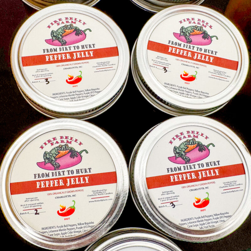 Using the tagline “From Dirt to Hurt,” Fire Belly Farm has expanded to a line of eight hot sauces (two are seasonal trials), each featuring various blends of the farm’s peppers, ranging from very mild to blazing hot. Several include the notorious locally developed Carolina Reaper, which was, until recently, the hottest consumable pepper in the world. It now ranks second behind Pepper X, also developed locally.