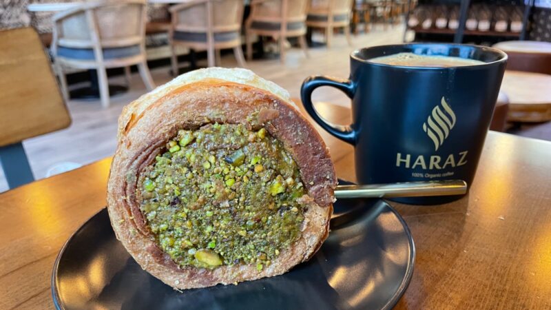 The popularity of the pistachio latte inspired another popular pastry, the round croissant, a circular croissant filled with cream. The pistachio flavor, which is popular in Middle Eastern culture, is topped with crushed pistachios. For now, other options include chocolate and strawberry.
