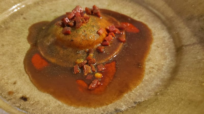 Pimento cheese ravioli, red eye sauce, sassafras powder, and crunchy Benton’s ham. Kristen Wile/UP