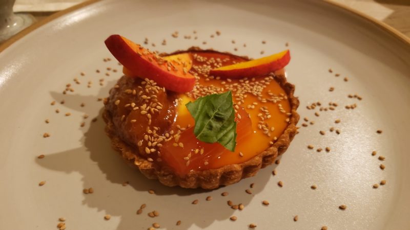 Orange and nectarine curd, benne seed tart, corn and peach jam, and Sauternes gel. Kristen Wile/UP
