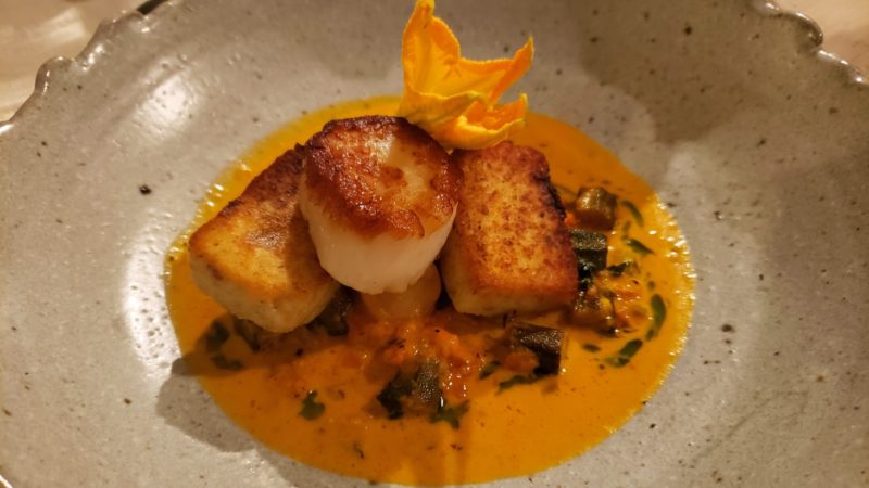 Seared scallops, grouper terrine, tomato chowder, and okra. Kristen Wile/UP