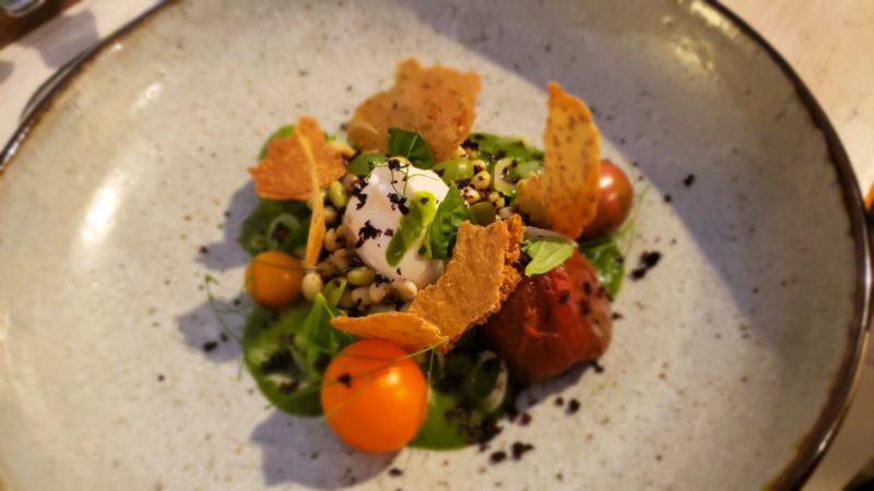 New Town Farms tomato salad with UAV burrata and dehydrated Castelvetrano olives. Kristen Wile/UP