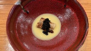 Dining on a Wednesday night, my friend and I were the only ones present at the 5:30 seating. While that made the six-seat chef’s counter feel even more intimate, we flew through the meal — the entire experience lasted about an hour and 15 minutes. It was certainly a meal that offers knowledge as well as sustenance; learning about the seasonal fish and their history in Japanese culture was fascinating. Hearing from the chef how to best enjoy each dish — with a bit of wasabi or soy sauce, for example — ensures the best possible bites. However, at such a high price point, I was surprised at some of the design decisions — the neon light from a beverage cooler, for example, detracts from the intimacy. The use of paper napkins feels odd in contrast to the warm cleansing towel you receive ahead of service.