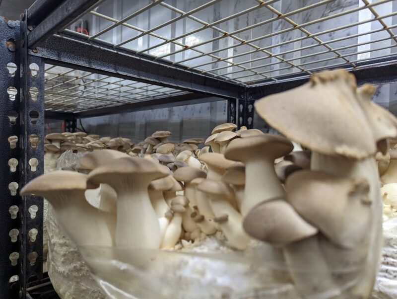 When they’ve fully harvested a mushroom block, the block is transported for compost at another farm, to be used in bettering the soil for that farm’s crops. The goal is to have the farm’s waste product — spent blocks and substrate — go to compost, which can grow food someplace else. Local farms, such as New Town Farms and Single Acre Farm, as well as some local master gardeners have been recipients of the spent mushroom blocks.