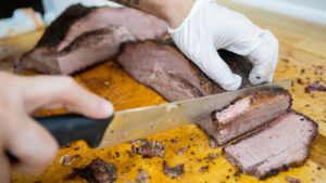 Lewis Donald slices barbecue fresh off the smoker at Sweet Lew’s. Photo by Peter Taylor.
