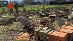Damage to the beehives at Renfrow Farms. Photo courtesy of Pressly Williams