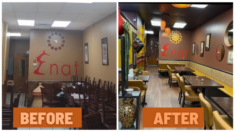 Several months after their initial encounter, Weaver decided to give Tedla a call to check in on her; she was the last new person he met before COVID-19 struck, and he wondered how she was doing as a fellow small business owner. Mired in small business setbacks and lows himself, he also needed a way to creatively recharge. He felt offering his artistic services to her might provide that, and help Tedla achieve her goal of improving Enat’s look and feel for guests. Trying to keep the lights on herself and operating only as a takeout restaurant, Tedla didn’t feel she could yet afford to do so.