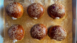 - Preheat the oven to 350 degrees. Whisk the eggs and milk together to make an egg wash. Brush the top and the sides of the buns with the egg wash evenly, then generously sprinkle with everything spice or sesame seeds. Bake for 40 to 45 minutes or until golden brown. Cool on a wire rack completely before filling.