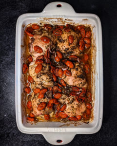 The dish is incredibly easy to make; season chicken thighs, place them in a casserole dish, and pour a tomato and garlic marinade on top and bake. That’s all. You might think the chicken will be dry because there isn’t much liquid from the marinade, but the chicken fat renders and melds into the tomato juices and marinade as it cooks to make a deliciously light and flavorful sauce. You can serve the chicken whole, as is, with rice pilaf or roasted vegetables and extra sauce poured on top, or chop the chicken thighs and toss with sauce and blistered tomatoes with angel hair pasta. If you have leftovers, chop the remaining thighs and top toasted bread with the cold chicken, tomatoes, and sauce and sprinkle with cheese and fresh basil for a heartier version of bruschetta for lunch.