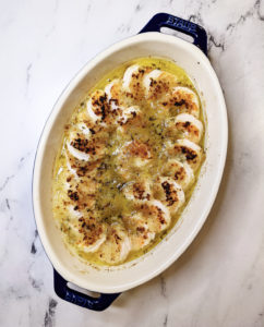 This recipe is commonly called shrimp scampi, but after reading more about the origins of the recipe and how it’s been altered over the course of time, I didn’t feel comfortable calling this shrimp scampi. Scampi are tiny, lobster-like crustaceans also known as langoustines. With a lack of scampi in the United States, immigrant Italian cooks replaced the pale pink crustacean with shrimp, but kept both names, possibly starting the confusion. Soon after the classic Italian scampi dish was Americanized, new interpretations began. Some began adding tomatoes, others topped the dish with breadcrumbs, and some recipes added crushed red pepper flakes and omitted the white wine. Even the preparation changed from sautéing in a pan to broiling in a casserole dish. The closest “original” recipe I could find for scampi is to sauté in white wine, olive oil, onions, and garlic. I grew up eating shrimp scampi as an appetizer, bubbling hot garlicky shrimp spooned onto bread with an extra helping of butter sauce. This recipe can be prepared as an appetizer or portioned on top of pasta for dinner. Adding the panko topping is optional, but I highly encourage the crispy texture if serving with pasta.