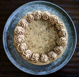 Growing up, springtime meant lots of cake. The rotation was often coconut, strawberry-lemon, pineapple upside-down, and my personal favorite German chocolate. The cakes my grandma or aunt would make were never completely from scratch; typically the cakes were from a boxed mix. The fillings and frostings were always homemade. This recipe for German chocolate cake is 100 percent from scratch and though there are several steps, the cake is very simple to make. The quantities are mostly in grams because weight measurements for cakes make for a more light and fluffy crumb. The key to making this cake is time management. Bake the cakes and make the coconut-pecan filling the day before serving. When ready to assemble, whip up the frosting and decorate.