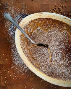 I never understood why anyone would eat Grape-Nuts cereal. The cereal is so hard, it’s tortuous to the roof of your mouth. The cereal dates back to the early 1900s, and was briefly made popular in the 1970s during the nature movement becoming the health conscious cereal of choice. It wasn’t until I moved to New England that I was introduced to using the now-unpopular cereal as an ingredient for both savory and sweet recipes. My favorite use of the cereal is for grape nut pudding, an eggy custard rich with warm spices. The cereal forms a bottom-layer crust giving the pudding a pie-like texture. In New England, folks go wild for this pudding –– you can usually find it on menus at diners. I find if you use a 9 x 9 baking dish, the cereal sinks to the bottom to form a thick sturdy crust. If you use a larger baking dish, the cereal mixes throughout the pudding. It’s still delicious, but you lack the defined layers of crust and custard. I love this dessert in the fall and as an alternative dessert for the holidays. If you want to be a true New Englander, serve the pudding with a drizzle of maple syrup.