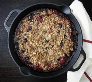 We should be making more crisps, cobblers, and buckles for special occasions. Cake and pie are great, but a simple, fruit-forward dessert is a refreshing change and pairs well with a glass of celebratory wine or Champagne. This recipe can be adapted to a variety of fruit for any season. The crisp topping is the star. Rather than using all-purpose flour, I opted for earthy wheat flour to balance the sweetness of the brown sugar and fat from the butter. Using less sugar than typical crisps, the dessert is balanced, allowing the flavors from the fruit and topping to stand out. Serve warm or cold, with a scoop of vanilla ice cream.