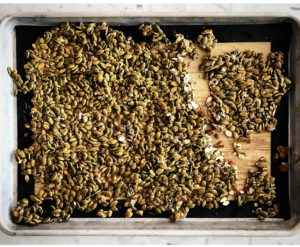 I feel guilty wasting pumpkins seeds after carving pumpkins, but when I was younger I never understood the thrill of roasted pumpkin seeds –– I could never get past the tough texture. It wasn’t until a friend in college made them that I realized how good they could be and that I, and my family, was skipping an important step in roasting them. Before roasting the seeds, you need to boil them in salted water to soften the shell. This step makes the texture more enjoyable to eat and easier to crack and remove the seeds (pepitas) from their shells. Once I mastered this step and started enjoying roasted pumpkin seeds, I started using the shelled seeds in other recipes. My favorite is pumpkin seed brittle. This quick recipe is great for Halloween after carving pumpkins. Place the brittle in a bowl, grab a few pumpkin beers, and enjoy the night watching scary movies. The brittle is also good as a garnish for pumpkin pie, cakes, or baked into blondies or brownies. If you want to skip roasting and shelling pumpkin seeds, you can find pepitas at most grocery stores.
