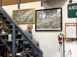 Ed Wood looks at aerial photos that show how U.S. Highway 74 bisected his family farm. Photo courtesy