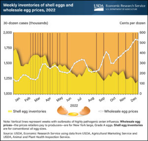 Disease. A variant of bird flu broke out in 2015 and has been periodically recurring ever since. Chickens are particularly susceptible to bird flu, with mortality rates as high as 90%. The current outbreak started in 2022 and so far has wiped out at least 49 million birds in 46 states, according to the CDC. This has especially impacted large commercial egg producers – which are the eggs you find on the supermarket shelves.