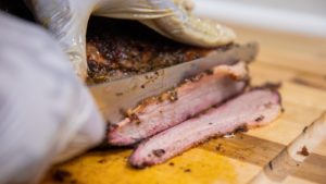 Brisket is sliced at Sweet Lew’s BBQ. Photo by Peter Taylor